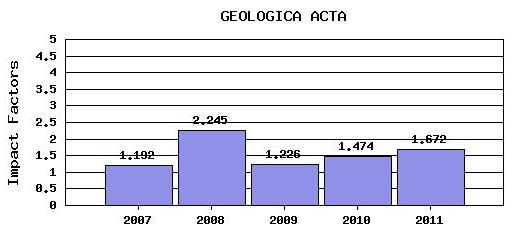La revista Geologica Acta, publicada a la Facultat de Geologia de la UB i en col·laboració amb el CSIC, IGC, UAB i UPC, està inclosa al Journal Citation Reports (Science Edition) des del 2007, concretament a la categoria GEOLOGY. Per a l’any 2011 el factor d’impacte és de 1,672 i ha augmentat respecte a l’any passat (1,474). Actualment ocupa el lloc 12è de les 46 revistes incloses a aquesta mateixa categoria, on també ha millorat, ja que l’any passat ocupava la 18ª posició de 48 revistes. L’evolució del factor d’impacte de Geologica Acta des del 2007 es pot veure en el següent gràfic: