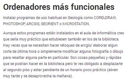 Tingueu en compte que la facultat disposa d’una litoteca i, tal com hem comentat en el cas de la proposta d’instal·lar programari especialitzat als ordinadors de la biblioteca, seria més adient encaminar esforços a fer que un servei de la facultat ja existent, en aquest cas la litoteca, oferís ampliar i millorar la seva oferta. Concretament que la litoteca tingués part de la seva col·lecció disponible per als usuaris de forma més oberta, potser amb algun espai específic destinat a la seva utilització. Sempre hi ha la possibilitat de treure en préstec de la biblioteca el material bibliogràfic que es necessiti per a aquesta activitat. Per a més informació podeu visitar aquest enllaç. - Aïllar la fotocopiadora i l’escàner (Omar Corrales): La falta d’espai a la Biblioteca de Geologia (UB-CSIC) és un problema. No tenim lloc per poder col·locar la fotocopiadora i l’escàner de forma que es minimitzi el soroll que implica